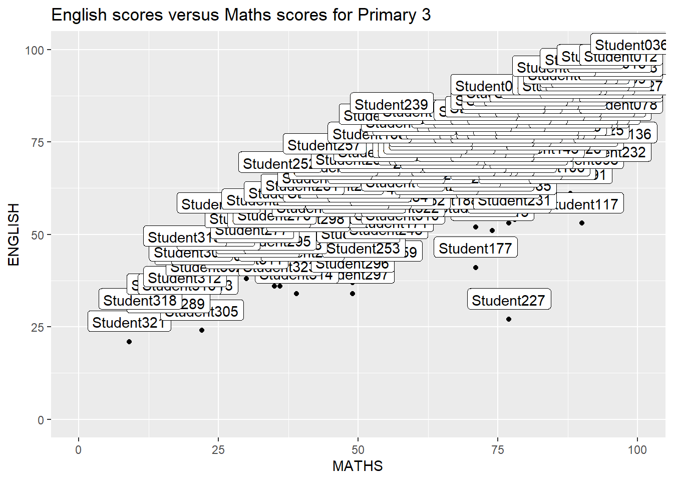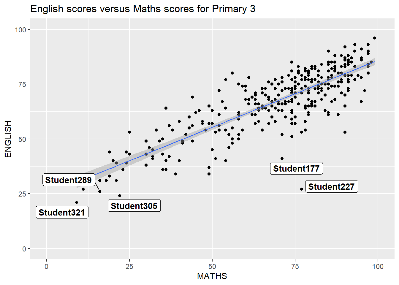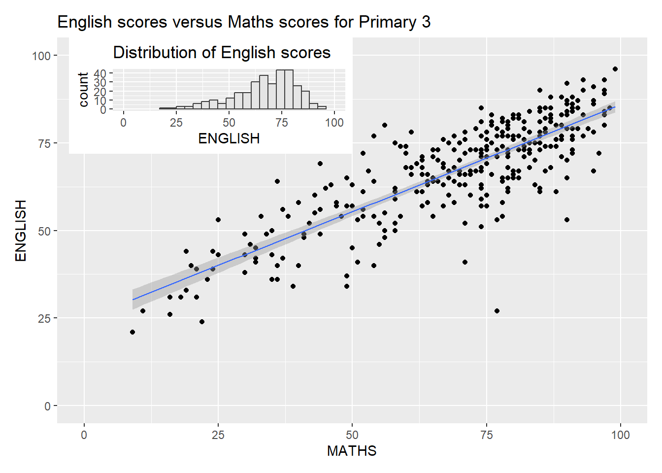 ggtitle("English scores versus Maths scores for Primary 3")Warning: Using `size` aesthetic for lines was deprecated in ggplot2 3.4.0.