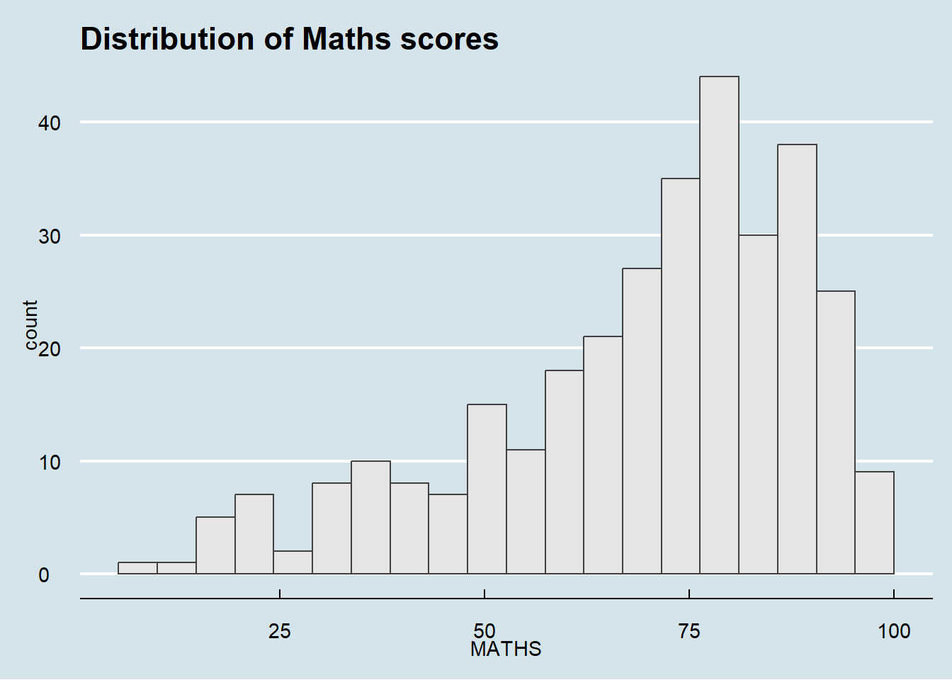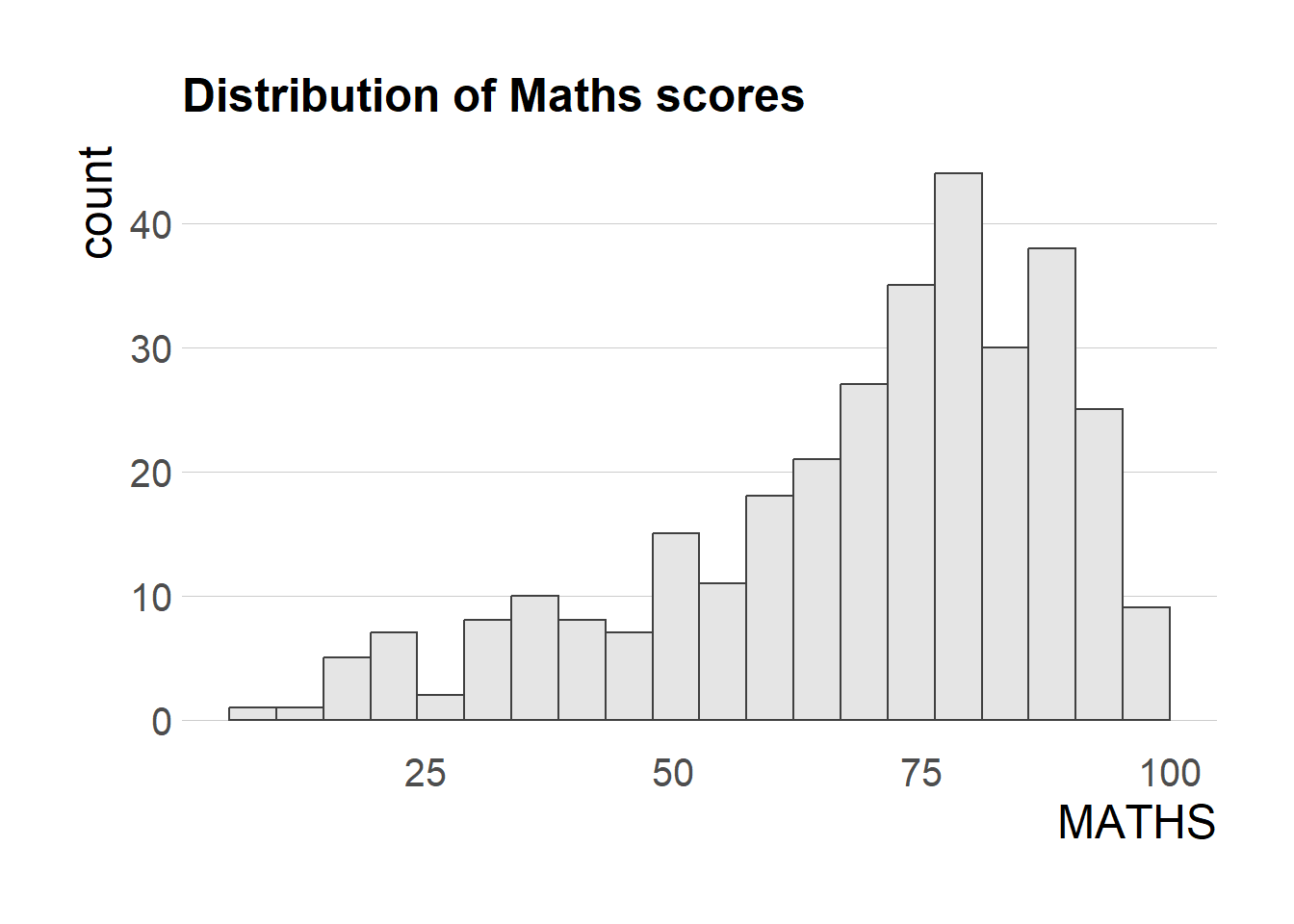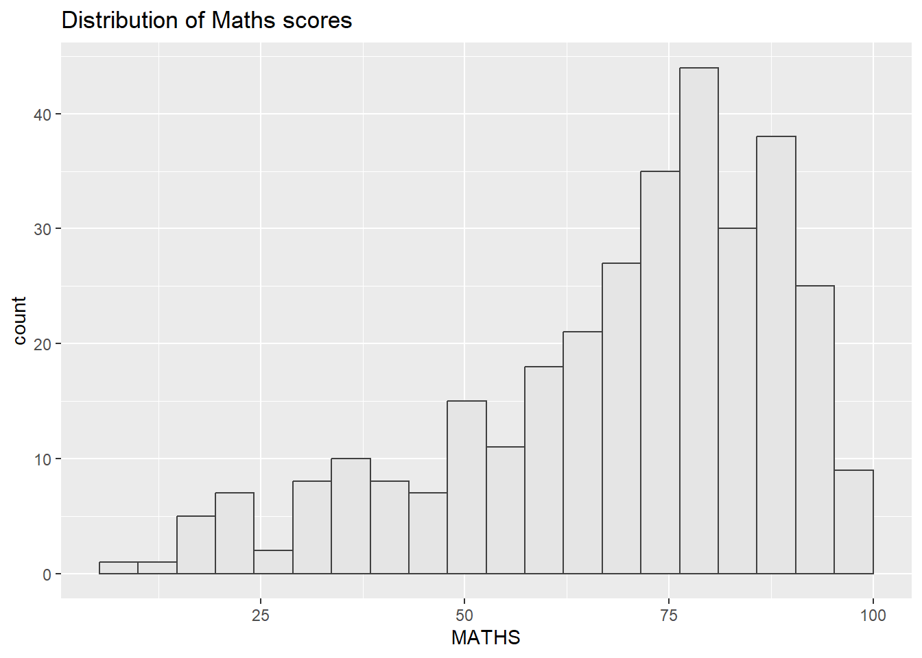 ggtitle("Distribution of Maths scores")Warning in grid.Call(C_stringMetric, as.graphicsAnnot(x$label)): font family not